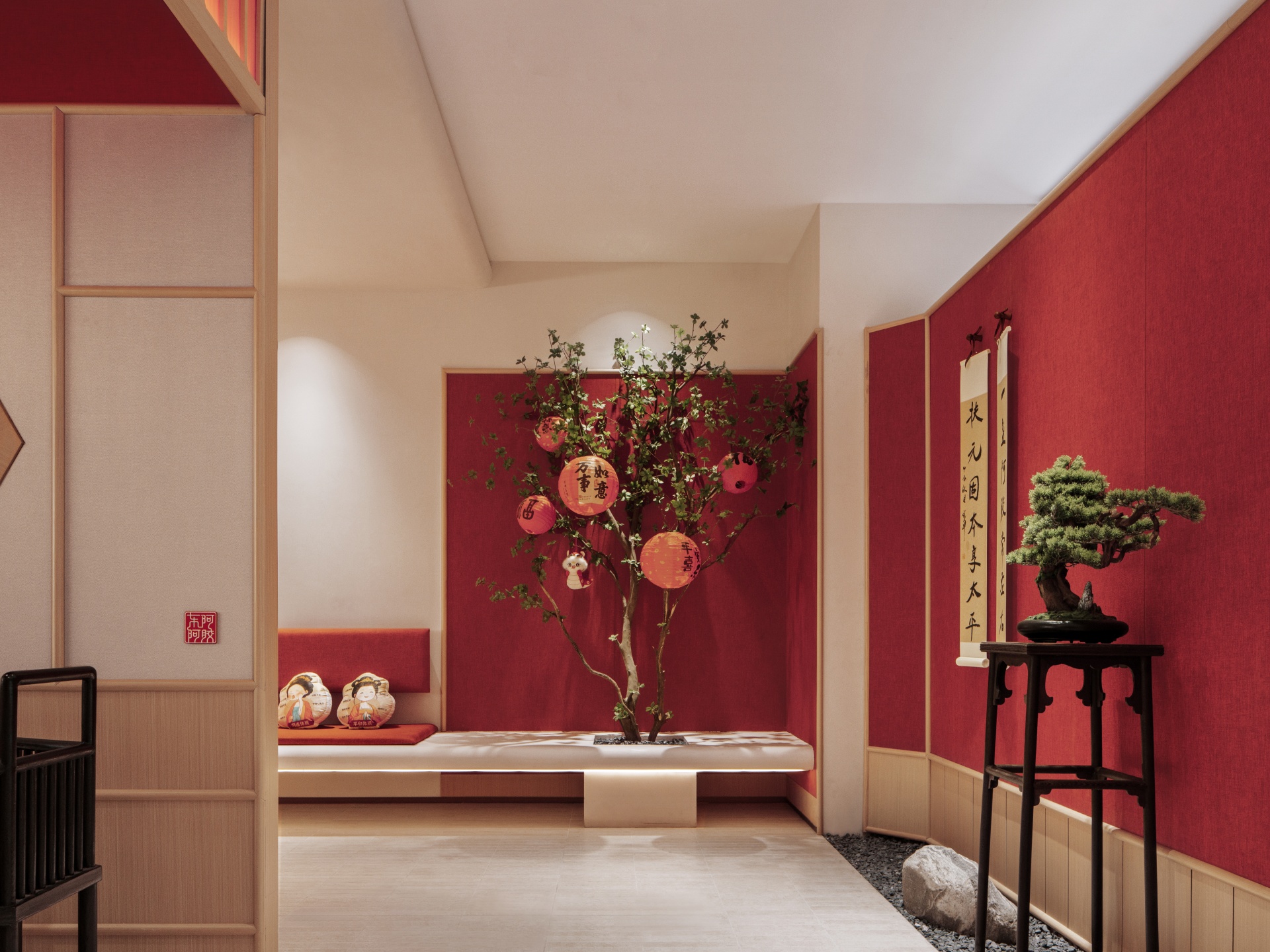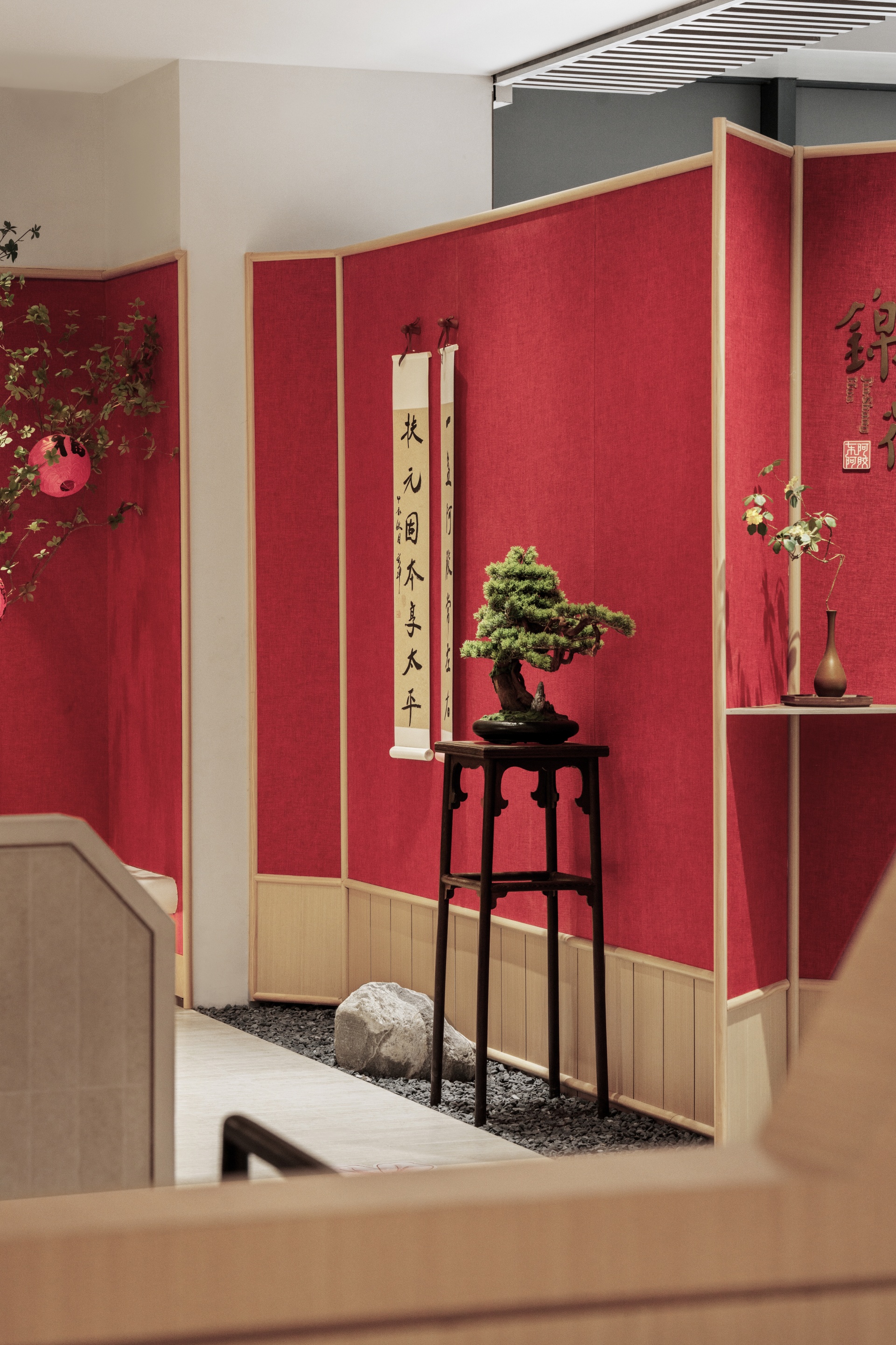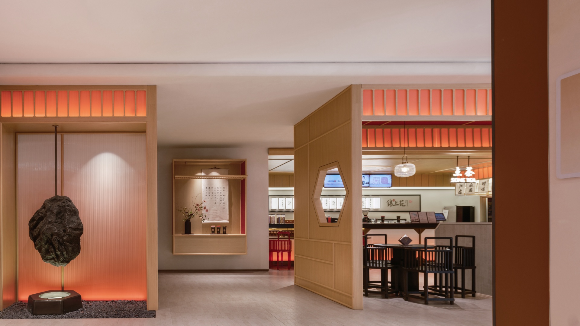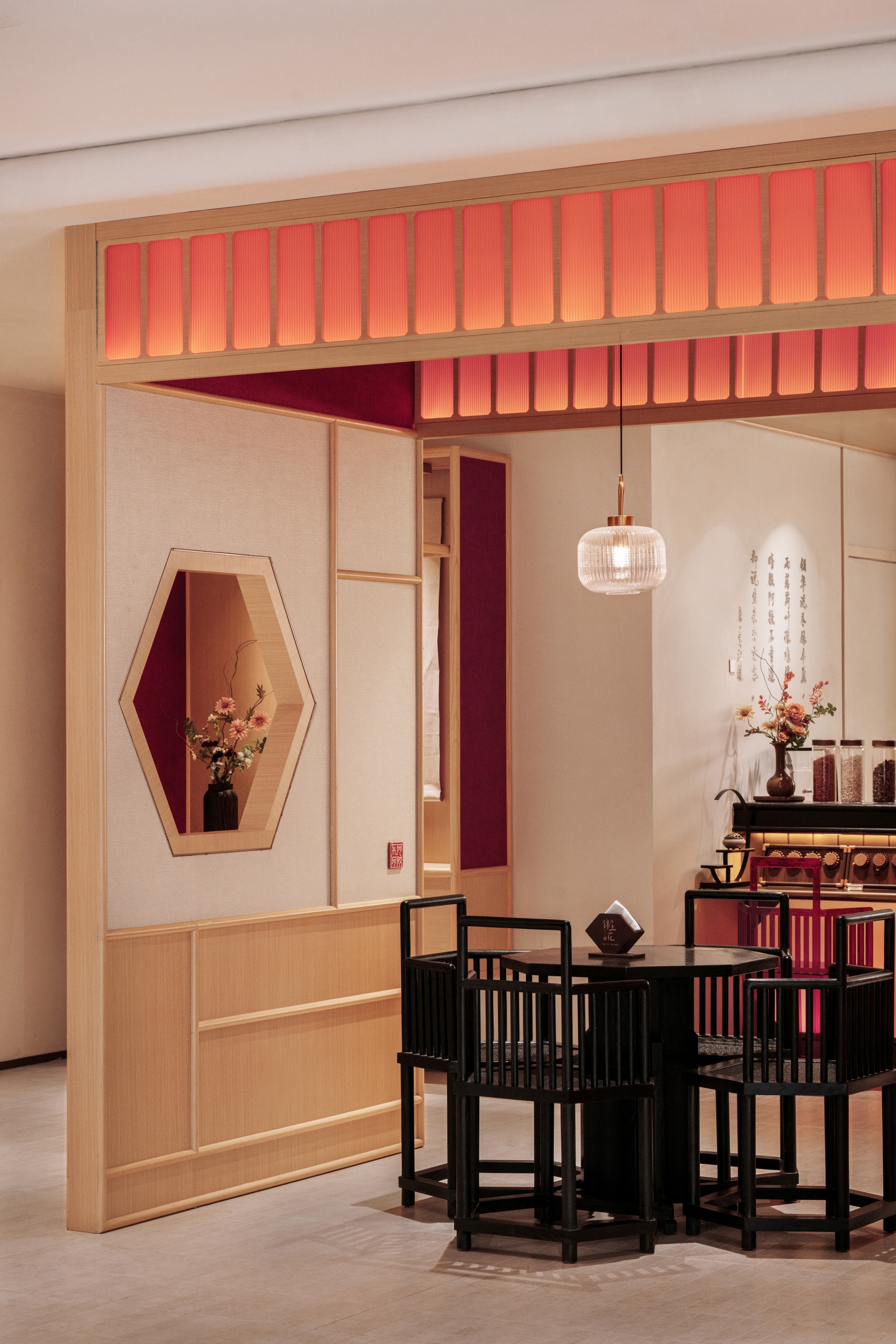 暖色调灯光与红黑元素交织,象征阴阳相济的和谐共生,木质桌椅与石质摆件则强调自然健康的重要性。