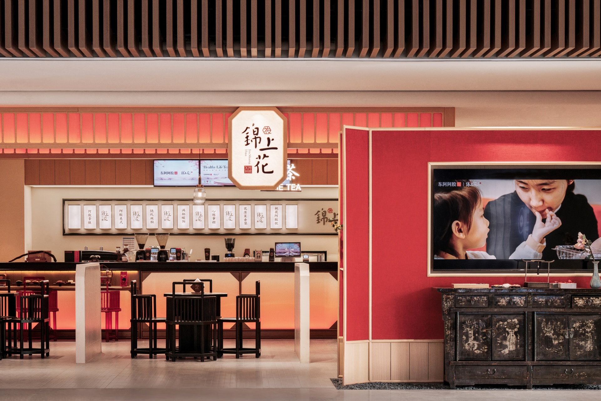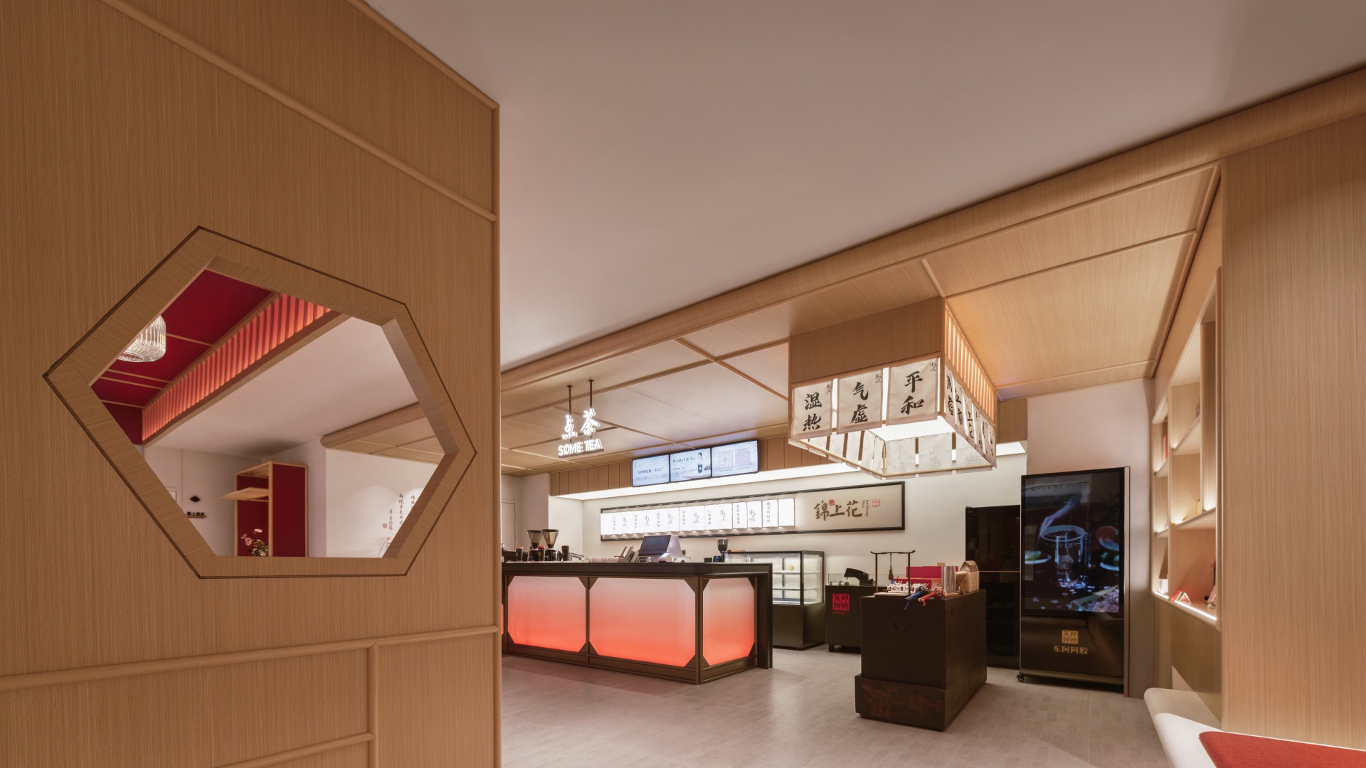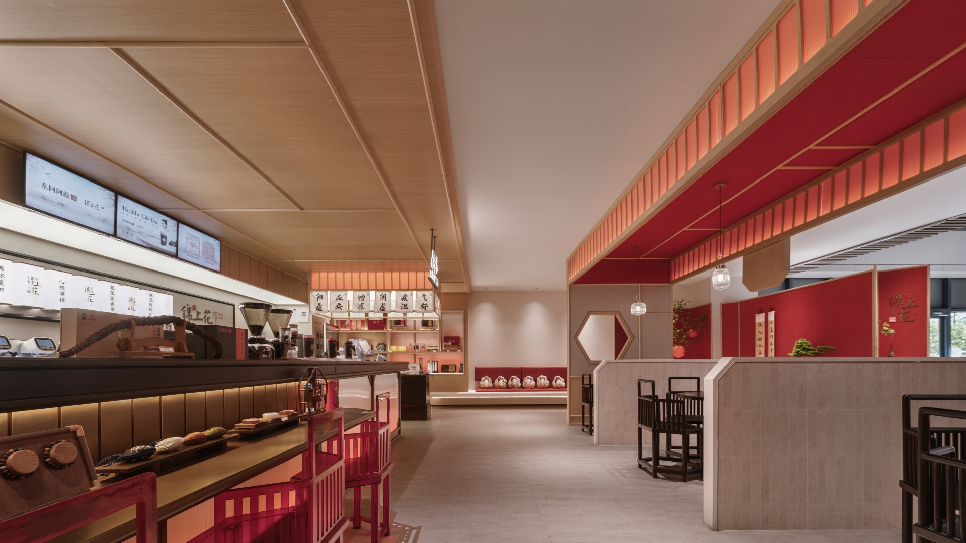 柒设计团队在与东阿阿胶合作中,致力于将传统养生文化与现代空间设计巧妙融合,打造出一个独特的养生茶饮空间。