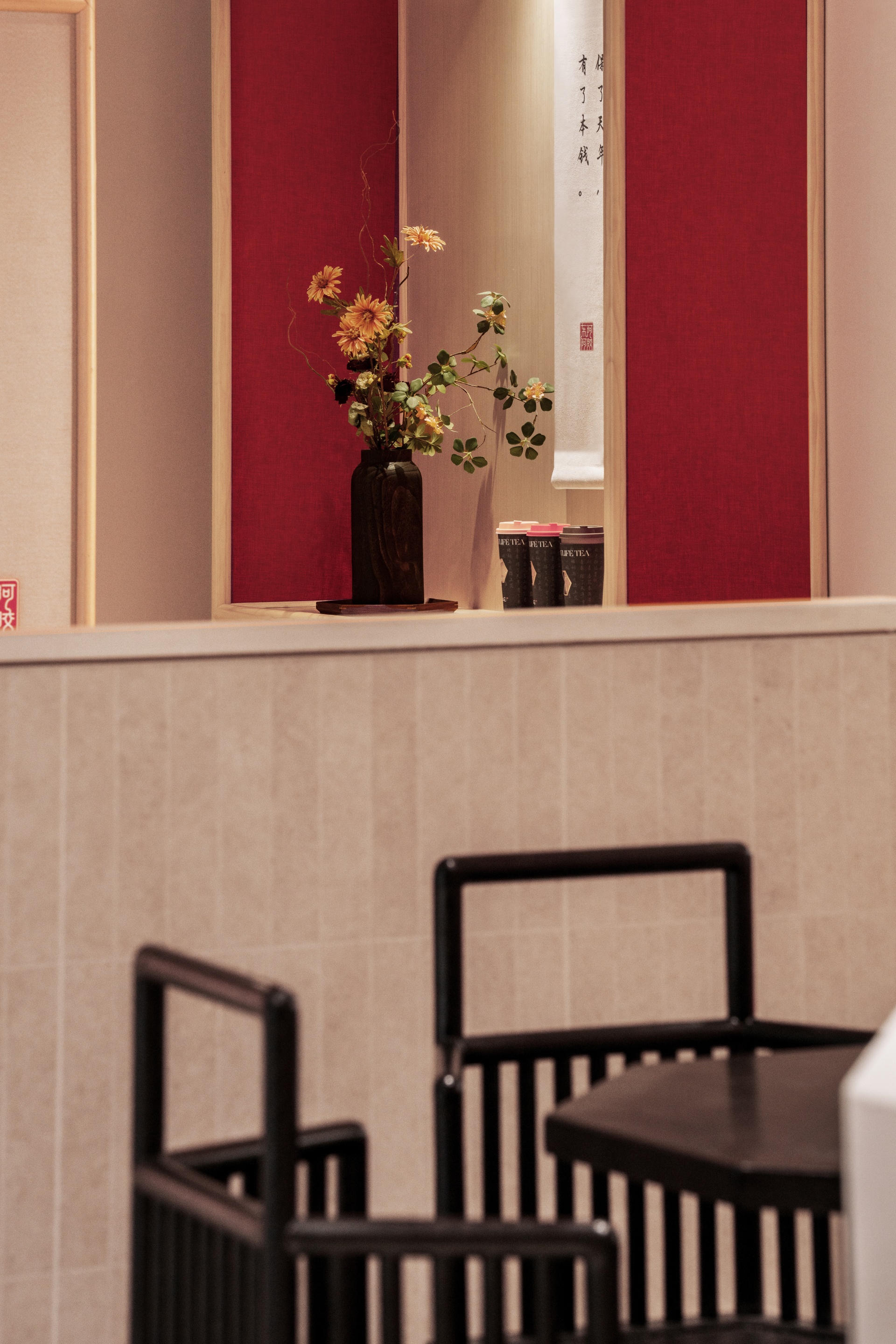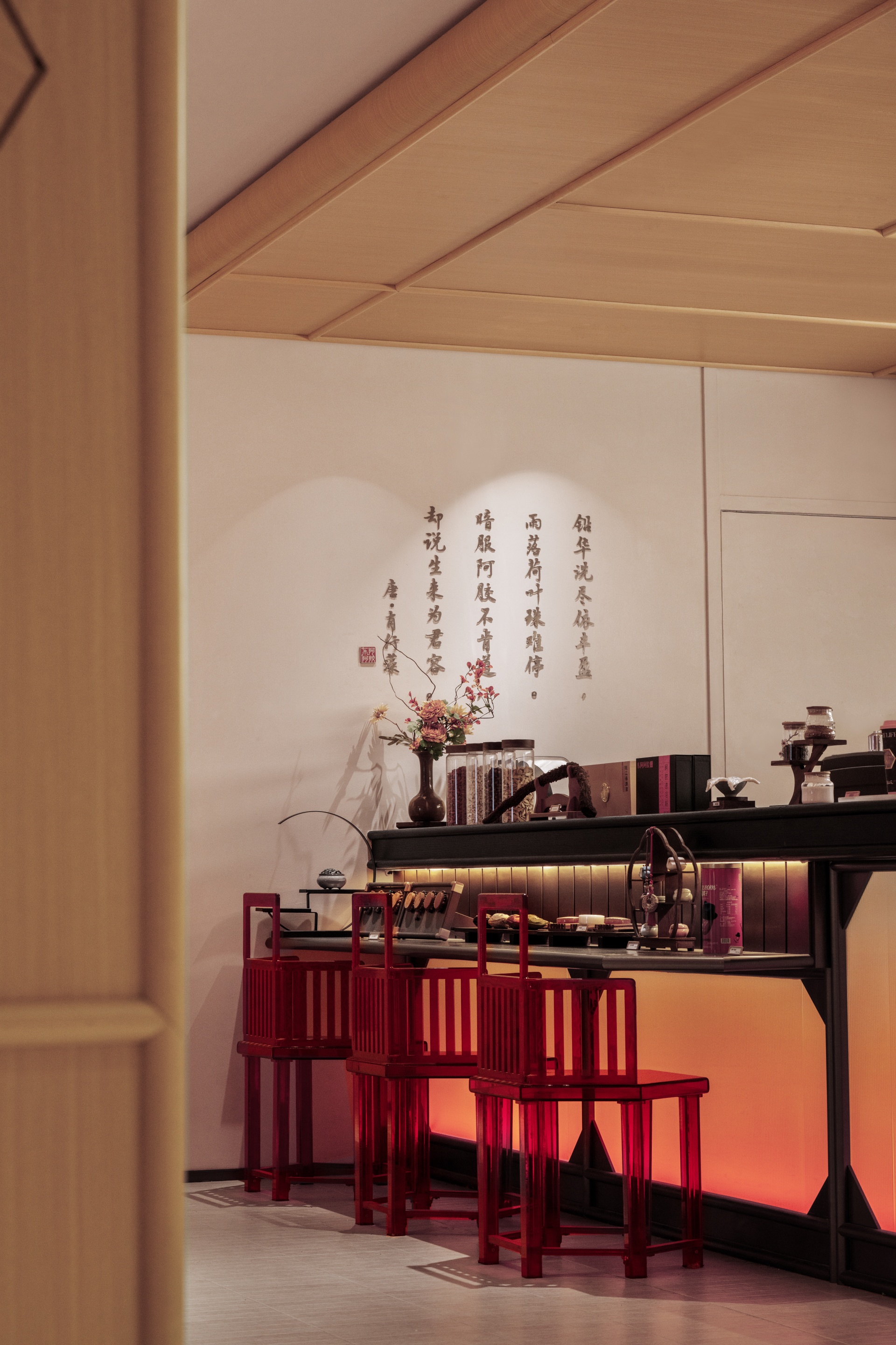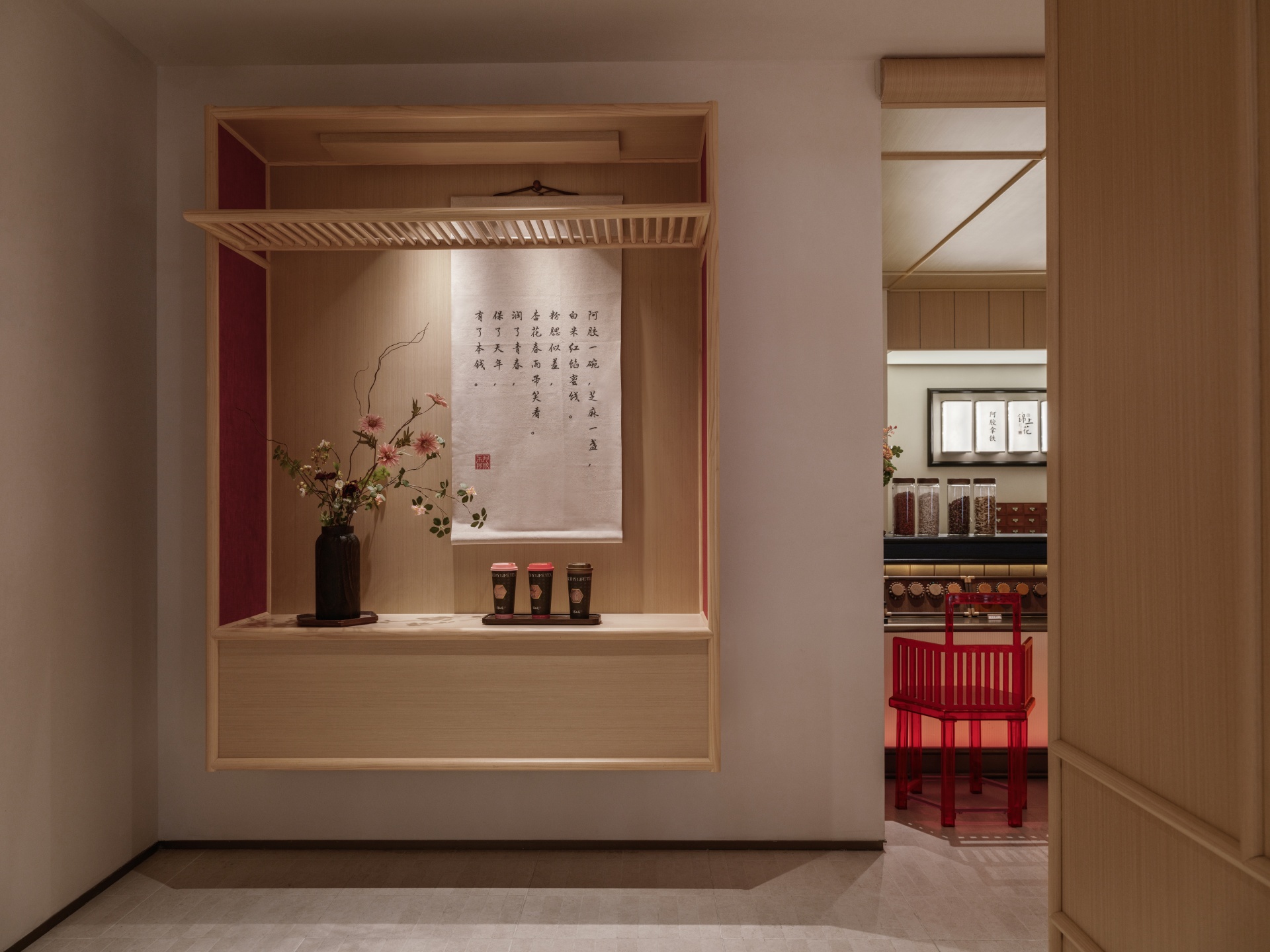 柒设计团队在与东阿阿胶合作中,致力于将传统养生文化与现代空间设计巧妙融合,打造出一个独特的养生茶饮空间。